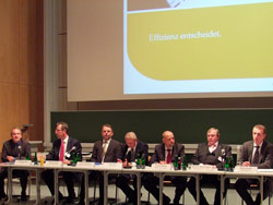 Bild unten: Unter dem Motte Effizienz entscheidet diskutierten (v.r.) Werner Diewald von der Enertrag AG; Bernd H. Williams- Book aus der Ortrander Eisenhütte GmbH; Thomas Bethke von den Stadtwerken Hennigsdorf; Ulrich Floß von der EMB GmbH, Minister Ulrich Junghanns, Stephan Kohler von der dena und als Moderator Wolfgang Albus vom RBB