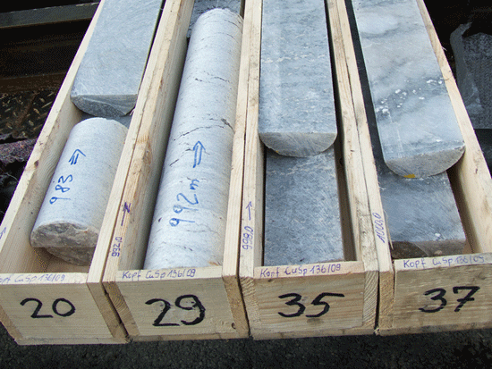 Am 4. Dezember präsentierte KSL erstmals Bohrkerne aus einer Tiefe bis 1000 m vom Bohrloch 136/9 in Spremberg. Derzeit werden die Proben in Kanada genau untersucht. Dieter Schleuter, Ingenieur bei KSL ist der Meinung, kurz vor der Kupferschieferlagerstätte zu sein. Hier liegt das Erz besonders tief. Bei der derzeit zweiten Bohrung 131/9 hofft man, schon bei 900 m fündig zu werden. Dort war am Freitag eine Tiefe von 470 m erreicht worden. Zur weiteren Eingrenzung der Lagerstätte laufen jetzt magnetotellurische Arbeiten an. Die Mailänder Firma Geosystem bringt dafür Meßstationen mit Magnetspulen von etwa 2 m Länge zum Einsatz. KSL nahm den Barbaratag zum Anlass, um Sprembergs Bürgermeister als Zeichen der guten Zusammenarbeit einen 265 kg schweren Bohrmeißel zu übergeben. Er soll im Bürgergarten ausgestellt werden. Weitere Infos zum Projekt >>> kupferschieferlausitz.com 07.12.09 F.J. |