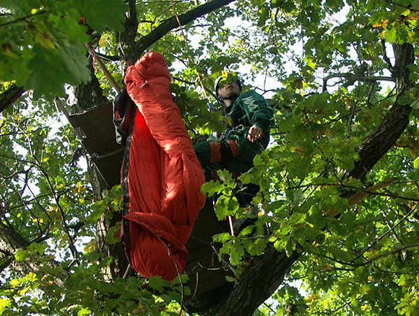 Erik aus dem Schwarzwald in seiner Eiche in Lacoma. Er versteht nicht, das so wenige Leute etwas gegen die Umweltzerstörung in der Lausitz unternehmen.
